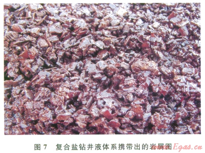 復(fù)合鹽鉆井液體系2011年開始在水平井全面推廣,累計應(yīng)用約100口井,平均縮短斜井段施工周期7~10d。有效抑制了石千峰組、石盒子組的坍塌,克服了PDC鉆頭泥包、黏卡等施工難題,攜帶出的巖屑棱角分明、形狀規(guī)整、無吸水膨脹,如圖7所示。