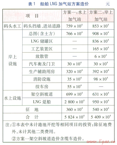 結(jié)合上述水上LNG加氣站方案、岸上LNG加氣站方案的建設(shè)內(nèi)容,對(duì)兩個(gè)方案進(jìn)行技術(shù)經(jīng)濟(jì)比較。船舶LNG加氣站方案造價(jià)見(jiàn)表1。