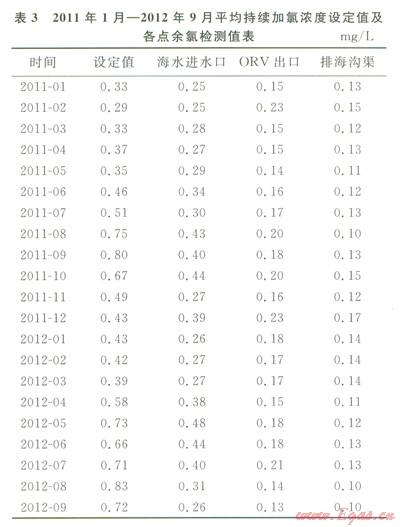 2009年1月至2012年9月,接收站加氯裝置一直連續(xù)運轉,采用單臺設備運行的方式,加氯濃度的設定同時考慮ORV承受能力及外排海水余氯環(huán)保要求。期間平均持續(xù)加氯濃度設定值及各點余氯檢測值見表2、3。