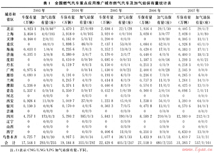 我國在“十五”、“十一五”期間投入巨大的人力和財力支持節(jié)能與新能源汽車重大項目。“十五”期間,我國有19個城市(地區(qū))開展了燃氣汽車示范推廣應(yīng)用,目前已達到22個。截至2007年燃氣汽車保有量達31.3837萬余輛,加氣站702座,詳見表1。其中,四川省作為首批燃氣汽車應(yīng)用推廣示范地區(qū),其燃氣汽車的技術(shù)研究和應(yīng)用推廣始終走在全國前列。乙醇汽油在吉林省全面推廣應(yīng)用,甲醇汽油在山西、陜西部分城市、四川瀘州等城市試點取得階段性經(jīng)驗成果;LNG公交車在長沙、貴陽試點取得階段性經(jīng)驗成果。