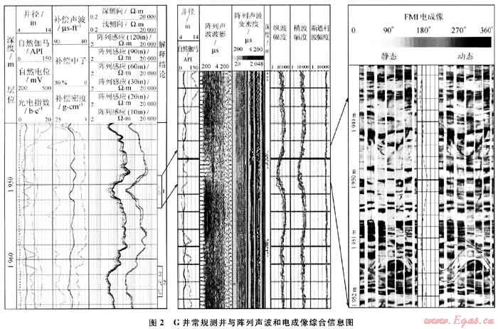 低孔裂縫型儲(chǔ)層:利用常規(guī)測(cè)井資料難以識(shí)別,需根據(jù)成像測(cè)井圖上的裂縫響應(yīng),陣列聲波變密度干擾圖形、波形幅度降低及陣列聲波縱波、橫波和斯通利波能量衰減,斯通利波計(jì)算的滲透率大等特征識(shí)別。如川東地區(qū)G井須家河組1948.8~1953.2m井段,用常規(guī)測(cè)井資料識(shí)別難度較大,但陣列聲波變密度干擾明顯、波形幅度降低及陣列聲波縱波、橫波和斯通利波能量有明顯衰減,電成像圖上有明顯裂縫顯示,可清楚說明該段裂縫較發(fā)育,為低孔一裂縫型儲(chǔ)層,中途測(cè)試產(chǎn)天然氣1.42×104m3/d。其測(cè)井特征詳見圖2。