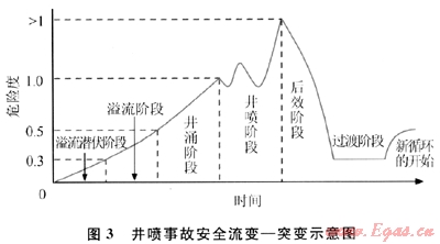 從以上分析可以得出:潛伏階段、溢流階段、井涌階段是井噴的安全流變階段,直到發(fā)生突變,才進入井噴的極不安全狀態(tài)。在此過程中,井內(nèi)壓力不斷減小、地層流體(石油、天然氣、水等)壓力不斷增大、鉆井液密度不斷降低致使鉆井液液柱壓力小于地層壓力,最終導(dǎo)致地層流體不斷流入井內(nèi),從而進一步向著井噴方向發(fā)展。如果該階段沒有采取有效的措施進行控制,便會向著井噴的方向發(fā)展,整個系統(tǒng)便由安全流變狀態(tài)向安全突變的方向轉(zhuǎn)變。當(dāng)油氣井處于安全流變階段時,整個系統(tǒng)還處于相對安全的狀態(tài);但一旦轉(zhuǎn)入突變,系統(tǒng)就會由安全狀態(tài)轉(zhuǎn)變?yōu)槲kU狀態(tài)。因此,要控制井噴事故,關(guān)鍵就是要將其控制在流變階段,進而消除危險源,防止其向突變的方向轉(zhuǎn)化。但如果突變之前沒有采取有效的抑制措施,最終導(dǎo)致了井噴事故的發(fā)生,也就是系統(tǒng)進入了安全突變階段,此階段最重要的就是要在保證人員和設(shè)備安全的情況下盡可能控制井噴范圍的擴大,最大限度地降低井噴所造成的損傷。