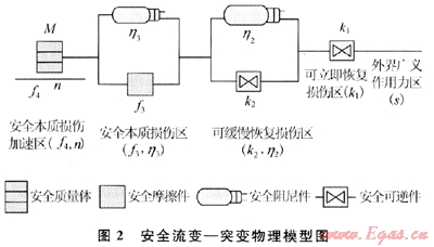 安全流變 突變的物理模型由4組元件組成(如圖2)。整個系統(tǒng)框架模型分為5個層次:外界廣義作用力區(qū)、可立即恢復(fù)損傷區(qū)、可緩慢恢復(fù)損傷區(qū)、安全本質(zhì)損傷區(qū)、安全本質(zhì)損傷加速區(qū),每個層次的反應(yīng)機理和作用各不相同。事物就是在這種模型下對外界廣義作用力作出相應(yīng)的反應(yīng),最終決定事物是處于安全狀態(tài)還是危險狀態(tài)的。
