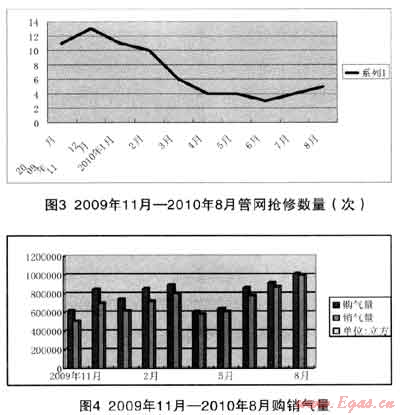 我公司2010年2月使用加濕技術(shù)時擁有干管鑄鐵閥門約61座,鑄鐵管網(wǎng)總長度84.8km,調(diào)壓站(箱)15個;日供氣能力約2.3萬m3。下面的一組圖表反映的是我公司2009-2010年加濕前后管網(wǎng)搶修及各月燃?xì)赓?、銷氣量及氣損統(tǒng)計情況: