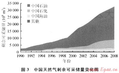 天然氣儲量進入新的增長高峰期。自2000年起,中國平均每年新增天然氣可采儲量3018億立方米,其中中國石油年均新增2238億立方米,占全國平均新增可采儲量的74%(圖2)。截至2008年底,中國累計探明天然氣可采儲量3.9萬億立方米。白1999年起,中國的天然氣剩余可采儲量快速增長,從1萬億立方米增至2008年的3.2萬億立方米,增長了2.2倍。截至2008年底,中國石油的剩余可采儲量占全國的74%(圖3)。天然氣儲量的高速增長支撐了全國天然氣產量的快速提高。