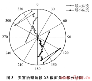 首先,管體應(yīng)力釋放要控制在合理范圍內(nèi)。一定長度內(nèi)的管體應(yīng)變既然已發(fā)生,就很難再回復(fù)到初始狀態(tài);過度的釋放有可能會加劇該管段的力學(xué)損傷,甚至影響相鄰管段的穩(wěn)定和安全。換言之,管體的應(yīng)力釋放是以減緩并消弱災(zāi)害風(fēng)險為目標(biāo)的,而不是像改線那樣去根除風(fēng)險。治理階段的應(yīng)變動態(tài)監(jiān)測可以控制應(yīng)力釋放的程度。其次,管體應(yīng)力的釋放要從低應(yīng)變區(qū)逐段向高應(yīng)變區(qū)迫近,而不是直接開挖管道變形最為劇烈的管段,否則有可能導(dǎo)致管體在卸載后大幅度振蕩,加劇管體損傷。隨著管溝的逐段開挖,該管段應(yīng)力分布也會發(fā)生即時變化,此時的應(yīng)變監(jiān)測數(shù)據(jù)可指導(dǎo)開挖進(jìn)度和開挖位置調(diào)整。最后,采用管道應(yīng)變監(jiān)測還可以獲得管線各監(jiān)測截面實(shí)時應(yīng)變極值的角度(如圖3),即角位移分析。角位移分析圖能夠清晰地表明最大應(yīng)力的方向、管道彎曲的方向,以及整個管段彎曲扭轉(zhuǎn)的狀態(tài)及趨勢,進(jìn)而指導(dǎo)對管體進(jìn)行細(xì)微的挪移。