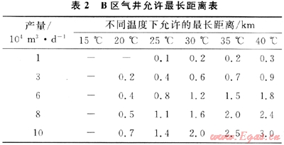 2) B區(qū)氣井的天然氣不伴熱直接進(jìn)站,需要加熱才能脫水,可以取消采氣管道伴熱。不同產(chǎn)氣量和井口溫度,允許采氣管道距離不同,其允許最長(zhǎng)距離見表2。