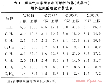 利用上述方法對煤層氣中常見有機可燃性氣體(或蒸氣)的爆炸極限進(jìn)行了計算(見表1)。