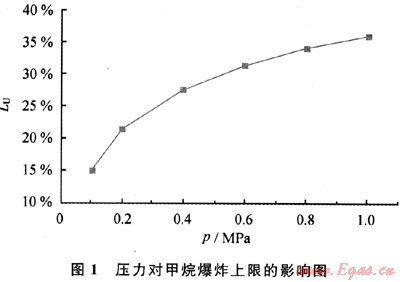 式中LU,p是壓力P時的爆炸上限;LU是常壓(p=0.1MPa)時的爆炸上限;p是燃?xì)饨^對壓力。