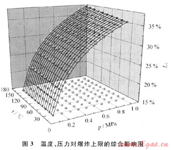 圖3給出了溫度和壓力對爆炸上限的綜合影響??梢钥闯鲭S著溫度、壓力的提高,爆炸極限范圍增大。在同一溫度下,壓力由0.1MPa升高到1.0MPa,其爆炸極限由15.14%擴大到35.74%。在同一壓力下,溫度由25℃升高到160℃,低壓時,爆炸上限幾乎沒有變化;在高壓時,爆炸上限由34.79%上升至35.74%。可見壓力對爆炸上限的影響甚于溫度對其的影響。因此,在煤層氣的工業(yè)生產(chǎn)中,應(yīng)盡可能在低壓下操作。