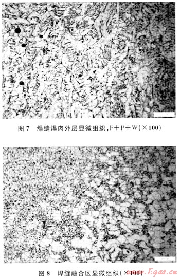 顯微組織及夾雜物分析結(jié)果表明:管線母材顯微組織為鐵素體+珠光體,有少量帶狀組織,且晶粒度為7.5級(jí)(圖5);熱影響區(qū)組織為鐵素體+珠光體,晶粒度分布極不均勻,范圍為5.5~9.5級(jí)(圖6);焊縫熔池組織為鐵素體+少量珠光體+少量魏氏組織,晶粒度為8.5級(jí)(圖7、8)。綜合評(píng)定該管線焊縫熔合情況為完全熔合。