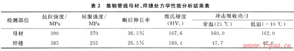 在四川某集輸管線上截取試樣分別按照國(guó)家標(biāo)準(zhǔn)進(jìn)行理化性能試驗(yàn),管線母材和焊縫的化學(xué)成分、力學(xué)性能綜合測(cè)試結(jié)果見(jiàn)表1、2。