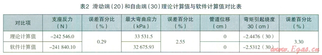 通過對(duì)兩種應(yīng)力計(jì)算結(jié)果的比較和誤差分析,很容易從上面列表中看出:理論計(jì)算值與軟件計(jì)算值中誤差最大者,即由管線自重引起的支座反力偶和最大彎曲應(yīng)力。這是由于軟件在計(jì)算過程中采用迭代法,而在理論計(jì)算中忽略了各投影面力矩之間互相關(guān)系的二次項(xiàng),從而造成兩者之間的誤差。因管線自重對(duì)整個(gè)管線應(yīng)力情況的影響最小,我們?cè)谶M(jìn)行管線應(yīng)力分析時(shí)主要考慮的管線影響因素就是溫度和內(nèi)壓。