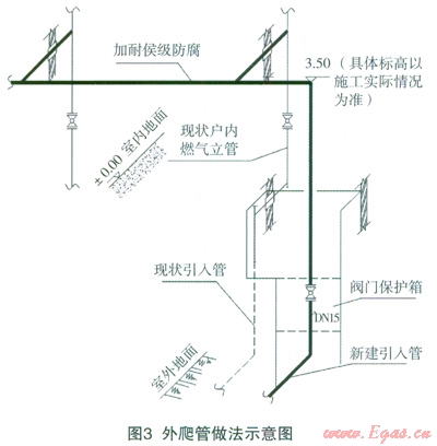 針對老舊小區(qū),戶內(nèi)立管往往位于居民室內(nèi)裝修或者包封內(nèi),改造難度較大或者不存在改造的可能性,可采用將引入管改至與首層立管相接處的方式,而不改造原有燃?xì)饬⒐?。如果存在地上引入口被占壓的情況,而且占壓物不便于拆除時(shí),可采用樓前管采用外爬墻方式敷設(shè),外爬管在樓房燃?xì)饬⒐芩趥?cè)爬至二層樓的0.5m高處,分別與現(xiàn)狀燃?xì)饬⒐芟嘟?,如圖3所示。