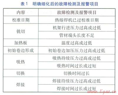 GBT 20674.12006對(duì)自動(dòng)熱熔焊機(jī)故障檢測(cè)項(xiàng)目的要求較為概括,因此我們對(duì)自動(dòng)熱熔焊機(jī)的故障檢測(cè)及報(bào)警項(xiàng)目進(jìn)行明確細(xì)化(見(jiàn)表l)。