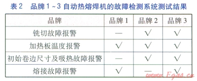 品牌l、2自動(dòng)熱熔焊機(jī)的故障檢測(cè)系統(tǒng)不完整,即使焊接參數(shù)不符合標(biāo)準(zhǔn)也可允許焊接繼續(xù)進(jìn)行。品牌l3自動(dòng)熱熔焊機(jī)的故障檢測(cè)系統(tǒng)測(cè)試結(jié)果見(jiàn)表2。由表2可知,品牌1、2自動(dòng)熱熔焊機(jī)未對(duì)表2中列舉的所有故障作出報(bào)警提示。