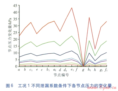 對圖4中的數(shù)據(jù)進(jìn)行處理求得工況l不同泄漏系數(shù)條件下各節(jié)點壓力相對于正常工況壓力的變化量,即正常工況時節(jié)點的壓力減去泄漏工況時節(jié)點的壓力,見圖6。