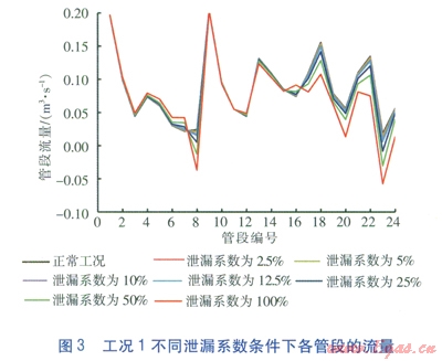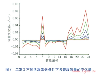 對上述數(shù)據(jù)進(jìn)行處理,求得工況l不同泄漏系數(shù)條件下各管段流量相對于正常工況流量的變化量,即正常工況時管段的流量減去泄漏工況時管段的流量,見圖5。
