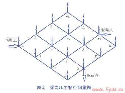 管網(wǎng)具有不同的運行工況時,如單氣源點或者多氣源點管網(wǎng)以及氣源點位置不同,單負(fù)荷點或者多負(fù)荷點以及負(fù)荷點位置不同,管網(wǎng)的壓力特征向量圖都是不同的,管網(wǎng)不同的環(huán)、不同的位置出現(xiàn)泄漏時對壓力特征向量的影響更是不同。在大量模擬數(shù)據(jù)以及實驗數(shù)據(jù)的基礎(chǔ)上,對各種不同工況下的泄漏進(jìn)行分析,可以依據(jù)壓力特征向量圖對其是否發(fā)生泄漏以及泄漏點位置進(jìn)行判定[2]。