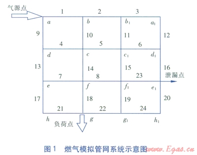 燃?xì)夤芫W(wǎng)泄漏檢測系統(tǒng)以模仿城市中壓燃?xì)夤芫W(wǎng)為主,可進(jìn)行泄漏檢測、泄漏點快速定位、SCADA系統(tǒng)監(jiān)測點選取及優(yōu)化等實驗。該系統(tǒng)管網(wǎng)采用公稱直徑為40mm,壁厚為3mm的U-PVC管搭建,每根管段的當(dāng)量長度均為26m,粗糙度為0.003mm[1]。在實際的實驗室模擬實驗中,采用空氣代替燃?xì)庾鳛檫\行介質(zhì)。將燃?xì)饽M管網(wǎng)系統(tǒng)中各節(jié)點用a~h,a1~h1表示,各管段用l~24表示。燃?xì)饽M管網(wǎng)系統(tǒng)示意圖見圖1。