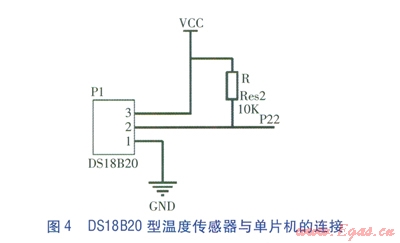 DSl8820型溫度傳感器是由美國(guó)DALLAS公司生產(chǎn)的單總線數(shù)字式智能溫度傳感器,測(cè)溫范圍為-55~125℃,具有獨(dú)特單總線(地址線、數(shù)據(jù)線、控制線合為一條信號(hào)線)接口方式,僅需要一根信號(hào)線就可以與STC89C52型單片機(jī)連接,實(shí)現(xiàn)雙向通信。DSl8820型溫度傳感器與單片機(jī)的連接見圖4。引腳1為地線接口,引腳2為數(shù)據(jù)通信線接口,引腳3為5 V電源線接口。