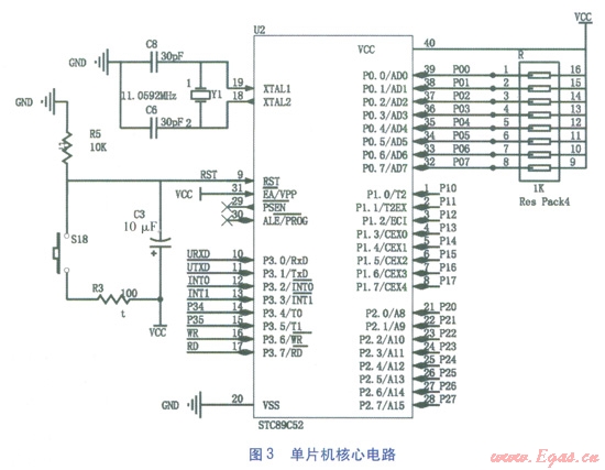 STC89C52型單片機(jī)是由STC公司生產(chǎn)的一種低功耗、高性能產(chǎn)品。采用ATMEL高密度非易失儲(chǔ)存器技術(shù)制造,與工業(yè)標(biāo)準(zhǔn)的MCS-51指令集和輸出引腳兼容。單片機(jī)核心電路見圖3。主要引腳功能:XTALl、XTAL2引腳為晶振接口,RST引腳為上電復(fù)位接口,P0系列引腳為上拉電阻接口,P21引腳為DHTll型溫濕度傳感器接口,P22引腳為DSl8820型溫度傳感器接口,URXD、UTXD引腳為與上位機(jī)的通信接口,其他引腳為備用。