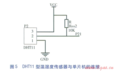 DHTll型溫濕度傳感器(由于其測(cè)溫范圍較窄,精度欠佳,因此選擇性控制系統(tǒng)只利用其測(cè)相對(duì)濕度功能)是一款含有已校準(zhǔn)數(shù)字信號(hào)輸出的單總線制溫濕度傳感器。DHTl l型溫濕度傳感器包括1個(gè)電阻式感濕元件、1個(gè)NTC測(cè)溫元件[5]。測(cè)量范圍:相對(duì)濕度20%~90%,溫度0~50℃。DHTll型溫濕度傳感器與單片機(jī)的連接見圖5。引腳1為地線接口,引腳2為數(shù)據(jù)通信線接口,引腳3為電源線接口。