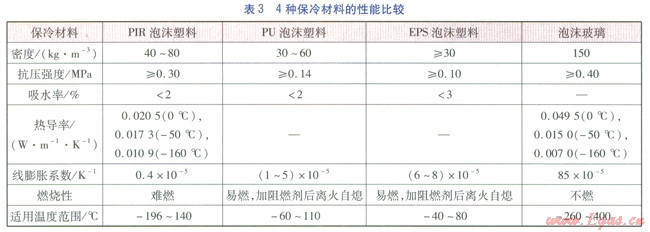 PIR泡沫塑料是一種深冷型保冷材料,具有優(yōu)良的耐熱性、耐寒性及阻燃性。與其他3種常用保冷材料的性能比較見表3。由于Pu(聚氨酯)泡沫塑料、EPS(可發(fā)性聚苯乙烯)泡沫塑料的適用溫度范圍不滿足天然氣液化工廠保冷工況下的操作溫度,因此未給出具體的熱導(dǎo)率。由表l、3可知,只有PIR泡沫塑料、泡沫玻璃適用于天然氣液化工廠保冷工況,但由于泡沫玻璃的線膨脹系數(shù)較大(對溫度變化敏感),因此宜采用PIR泡沫塑料。