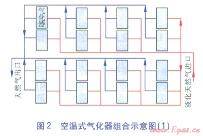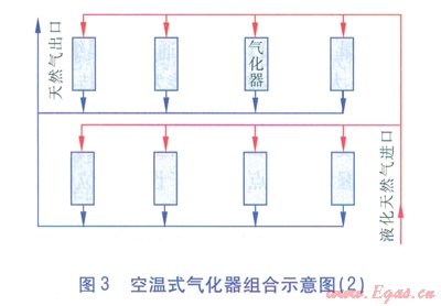 空溫式氣化器的臺數(shù)和氣化量,可跟據(jù)工程建設(shè)規(guī)模和用戶的要求綜合確定。空溫式氣化器組合示意見圖2、3