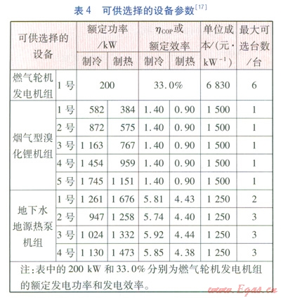 系統(tǒng)可供選擇的設(shè)備參數(shù)見(jiàn)表4。在計(jì)算中,貸款年利率取5.94%,設(shè)備的使用年限統(tǒng)一取l5a。分時(shí)電價(jià)為:10:00~15:00、18:00~21:00為峰段,電價(jià)l.0125元/(kW·h);23:00~7:00為谷段,電價(jià)0.3535元(kW·h);7:00—10:00、15:00~18:00、21:00~23:00為平段,電價(jià)0.6725元/(kW·h)。氣價(jià)取l.85元/m3,天然氣低熱值取35.2 MJ/m3。燃?xì)廨啓C(jī)模型中的系數(shù)取值見(jiàn)文獻(xiàn)
