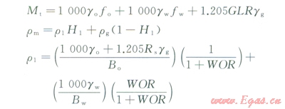 式中P為井筒中任意點(diǎn)的壓力,MPa;D為井深,m;rm為氣液混合物的密度,kg/m3;um為氣液混合物的流速,m/s;g為重力加速度,m/s2;fm為兩相摩阻系數(shù);d為油管內(nèi)徑,m;qt為地面產(chǎn)液量,m3/d;Mt為地面標(biāo)況下,每生產(chǎn)1m3液體伴生油、氣、水的總質(zhì)量,kg/m3;H1為持液率;r1為液體密度,kg/m3;go、gg、gw分別為油、氣、水的相對(duì)密度;Rs為天然氣的溶解氣油比;Bo、Bw分別為油、水的體積系數(shù);WOR為生產(chǎn)水油比;rw、rg分別為水、氣的密度,kf/m3;¦w、¦o分別為所產(chǎn)液體中的含水率、含油率;GLR為氣液比。