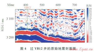 目前,各種地震疊前數(shù)據(jù)反演的軟件[16]。和疊前反演的方法[17-22]都比較成熟,通過(guò)較好的疊前三維地震資料可以較準(zhǔn)確地反演出縱波速度、橫波速度和體積密度等彈性參數(shù)。圖4為過(guò)YBl2井的原始疊后地震剖面。儲(chǔ)層位于圖中標(biāo)注的層位為下三疊統(tǒng)飛仙關(guān)組一段上二疊統(tǒng)長(zhǎng)興組之間[23-25]。從剖面上可以看出地層的橫向變化大,分辨率低,信噪比較低等特征。圖5-a、b和c分別為應(yīng)用疊前同時(shí)反演方法獲得的縱波速度、橫波速度和體積密度反演剖面。從圖中可以看出,井旁道反演的數(shù)據(jù)與測(cè)井曲線的相關(guān)性較好。從反演數(shù)據(jù)剖面中可以發(fā)現(xiàn),疊前彈性參數(shù)反演獲得橫波速度數(shù)據(jù)和密度數(shù)據(jù)剖面的分辨率高于縱波速度數(shù)據(jù)剖面上的分辨率,為縱向高分辨率的孔隙度計(jì)算提供了條件。圖6為應(yīng)用本方法計(jì)算的過(guò)YB12井的孔隙度剖面。從圖6中還可以看出,計(jì)算孔隙度與實(shí)測(cè)孔隙度之間的相關(guān)性非常高,計(jì)算的孔隙度數(shù)據(jù)的分布范圍也與測(cè)井?dāng)?shù)據(jù)相當(dāng)吻合,并且從孔隙度剖面上能夠?qū)⒃搩?chǔ)層段分為上下兩套孔隙度發(fā)育的儲(chǔ)層,孔隙度計(jì)算剖面上展布的橫向規(guī)律與地質(zhì)、鉆井認(rèn)識(shí)規(guī)律保持一致。因此,從孔隙度計(jì)算的結(jié)果可以看出,筆者提議的孔隙度計(jì)算方法在碳酸鹽巖儲(chǔ)層孔隙度計(jì)算中效果比較明顯,能夠較好地提高孔隙度計(jì)算的精確度。