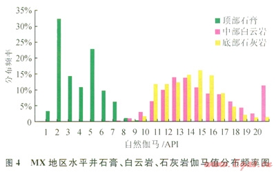 伽馬值衡量的是地層中放射性物質(zhì)含量,對儲(chǔ)層判別基本不起作用。但根據(jù)MX地區(qū)區(qū)域資料,自然伽馬能有效識別出儲(chǔ)層頂部石膏層。如圖4所示,頂部石膏的伽馬值主要集中在1~8API,而中部白云巖的伽馬值主要集中在8~20API,底部石灰?guī)r的伽馬值主要集中在9~l8API,石灰?guī)r、白云巖與石膏的差異非常明顯??捎?span lang="EN-US">8API作為石膏的輔助判別上限。