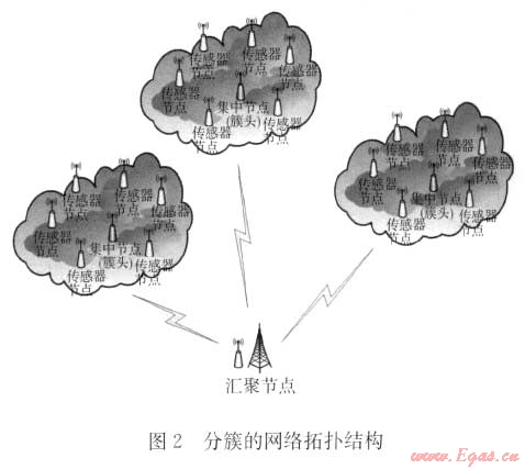 考慮到系統(tǒng)網(wǎng)絡(luò)結(jié)構(gòu)的特點(diǎn)和應(yīng)用到管道監(jiān)測中實(shí)際的網(wǎng)絡(luò)拓?fù)洌酚蓞f(xié)議采用了多層次分簇的協(xié)議[4],具體網(wǎng)絡(luò)結(jié)構(gòu)和工作過程見章節(jié)1。