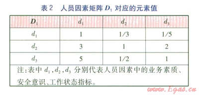 利用方根法計算,可以得出指標層對準則層各因素的權(quán)重,人員因素矩陣D1對應(yīng)的元素值見表2。