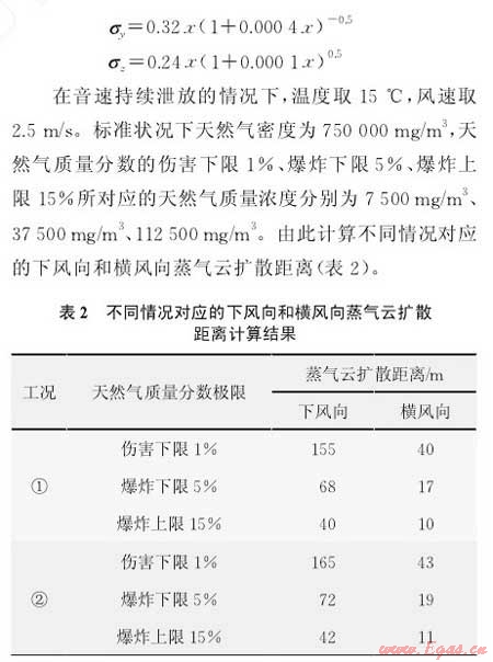 基于管道內(nèi)部參數(shù)相關(guān)的壓力、泄漏面積、泄漏口形狀、管道內(nèi)部質(zhì)量(氣源狀況),以及管道外部參數(shù)相關(guān)的地面風(fēng)速、大氣穩(wěn)定度、地面狀況等,假設(shè)泄漏為穩(wěn)態(tài)小孔泄漏,對天然氣管道泄漏影響區(qū)域進(jìn)行計(jì)算,得出如下結(jié)論: