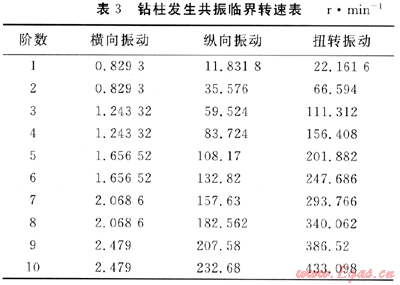 將表2中鉆柱振動的固有頻率計算結(jié)果分別代入上式得到鉆柱共振不同階數(shù)的臨界轉(zhuǎn)速,如表3所示。
