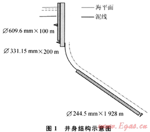 2) 井距很密,就要考慮表層預(yù)斜的方案。因此,在表層就要開始造斜,確保后面鉆井作業(yè)的安全,此時(shí)采用鉆具組合一定要注意:①一定要使用牙輪鉆頭;②要采用彎接頭馬達(dá)和陀螺的組合;③要確保造斜率,使預(yù)造斜在淺層就要成功。所采用的鉆具組合為: