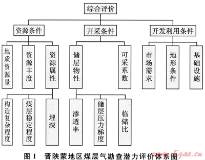 基于對(duì)晉陜蒙地區(qū)煤田地質(zhì)、煤層氣地質(zhì)資料及開發(fā)數(shù)據(jù)的分析,認(rèn)為影響本區(qū)煤層氣資源勘查潛力的因素主要有資源條件、開采條件、開發(fā)利用條件3個(gè)方面,具體評(píng)價(jià)指標(biāo)體系見圖1。