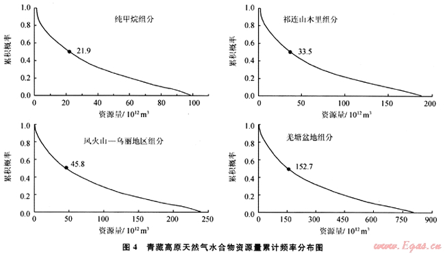 運(yùn)用體積法估算天然氣水合物資源量時(shí),由于上述5個(gè)參數(shù)特別是沉積物孔隙度(φ)和水合物飽和度(H)的取值范圍變化較大,從而影響了計(jì)算結(jié)果的可信度。因此,利用蒙特卡羅法對青藏高原的資源量再次進(jìn)行了估算。蒙特卡羅法是利用各種隨機(jī)變量的抽樣序列模擬給定概率的統(tǒng)計(jì)模型,得出數(shù)值解的近似統(tǒng)計(jì)值。體積法計(jì)算天然氣水合物資源量的5個(gè)參數(shù)中除分布面積(A)外,其他4個(gè)參數(shù)都是獨(dú)立的隨機(jī)變量,針對任一隨機(jī)變量蒙特卡羅法均可根據(jù)大量的實(shí)測數(shù)據(jù)(或理論假設(shè)數(shù)據(jù)),計(jì)算出相應(yīng)的頻率曲線,再根據(jù)頻率曲線給出一定頻率下的樣本值。然后根據(jù)一定概率下(例如0.5)各參數(shù)的樣本值計(jì)算出這一概率下的天然氣水合物資源量。蒙特卡羅法的估算結(jié)果顯示,在0.5概率下青藏高原純甲烷組分、祁連山木里組分、風(fēng)火山-烏麗地區(qū)組分和羌塘盆地組分天然氣水合物的資源量分別為21.9×1012m3、33.5×1012m3、45.8×1012m3和153×1012m3(圖4),均比體積法估算的相應(yīng)資源量要大。