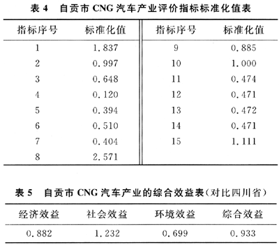 按上述評(píng)價(jià)模型,將2007年自貢市CNG汽車產(chǎn)業(yè)評(píng)價(jià)指標(biāo)標(biāo)準(zhǔn)化,其結(jié)果如表4。綜合效益計(jì)算結(jié)果見(jiàn)表5。