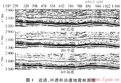 對(duì)3個(gè)數(shù)據(jù)體進(jìn)行頻譜分析,近道頻率范圍在4.32~80.37Hz之間,中道在4.32~64.24Hz之間,遠(yuǎn)道在4.77~60.77Hz之間,也就是說近道的剖面分辨率最高,中道次之,遠(yuǎn)道分辨率最低。在圖1中,可以看出近道剖面顯示出的細(xì)節(jié)性要比遠(yuǎn)道剖面清晰得多,中道好于遠(yuǎn)道而差于近道。