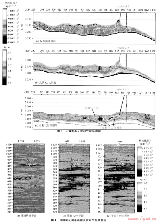 從反演結(jié)果(圖3-a,圖3-b,圖4-a,圖4-b)以及井曲線的敏感屬性分析可以得到,syb1井在目的層段的多種屬性基本上表現(xiàn)出不是良好的儲(chǔ)氣層段,而 syb1c1井的井底位置恰好在多種屬性分析上都表現(xiàn)出是良好的儲(chǔ)氣層段。這也直接驗(yàn)證了syb1井是低產(chǎn)井,而syb1c1井是一個(gè)高產(chǎn)氣井的客觀事實(shí)。對(duì)于本區(qū)含氣儲(chǔ)層段,橫波阻抗和vp/vs屬性是檢測(cè)氣藏非常好的2個(gè)參數(shù),因此,選擇橫波阻抗和vp/vs屬性體進(jìn)行有利氣層預(yù)測(cè)。圖3-c和圖4-c是有利氣層預(yù)測(cè)的過井剖面圖及目的層平面上有利氣層預(yù)測(cè)圖。