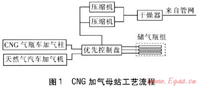 進(jìn)站計(jì)量和脫水裝置設(shè)在壓縮機(jī)前,起到計(jì)量和凈化作用。天然氣經(jīng)壓縮機(jī)加壓后進(jìn)入儲(chǔ)氣瓶組或者通過(guò)加氣柱、加氣機(jī)為車(chē)輛加氣。優(yōu)先控制盤(pán)則對(duì)整個(gè)加氣站及加氣過(guò)程進(jìn)行控制。空壓機(jī)為站內(nèi)氣動(dòng)閥提供壓縮空氣。