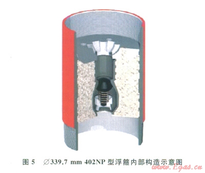 Æ339.7mm和Æ508.0mm的套管鉆井所使用的浮箍,前者的型號(hào)為402NP型(圖5),后者的型號(hào)為402型。這2種浮箍的最大特點(diǎn)是:超密Ⅲ型(Sure-Seal 3TM)單流閥,性能優(yōu)良,可以耐受長(zhǎng)時(shí)間大排量鉆井液的沖刷。另外402NP型有l個(gè)花瓣?duì)畹某薪颖P(pán),可以保證在下一次開(kāi)鉆被鉆掉時(shí),膠塞不發(fā)生旋轉(zhuǎn)[12-14]。
