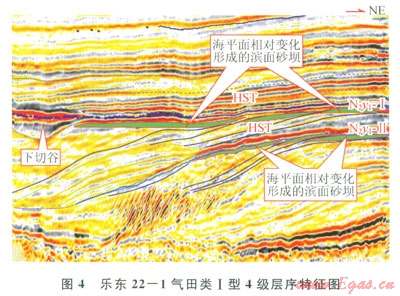 樂東22-1氣田主物源來自北東方向的海南島,為發(fā)育在陸架濱 淺海背景下,受沉積坡折控制的灘壩復(fù)合體沉積。儲層的形成,與海平面短期快速升降、強制性海退背景下形成的4級層序有關(guān)。4級層序界面以類工型界面為主,層序結(jié)構(gòu)主要表現(xiàn)為前積型特征,頂積層較薄(圖4)。S型疊加4級層序的頂積層可形成良好的儲集層,在沉積坡折以下多以淺海相泥巖、泥質(zhì)粉砂巖為主,儲層不發(fā)育(圖5)。準確把握層序形成機制和疊加樣式[7-8],可以有效地預(yù)測和把握有利儲層的分布,減少儲層預(yù)測上的失誤,降低風(fēng)險。通過對儲層的精細描述,刻畫有利砂體的展布,指導(dǎo)生產(chǎn)井的部署和井位優(yōu)化。
