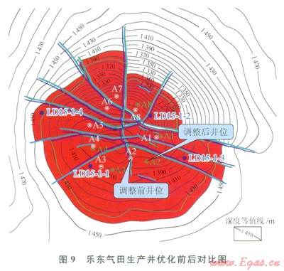 如前所述,筆者工作中采用的3種改進(jìn)方法均能有效地提高斷層,特別是微、小的解釋精度,但單一的方法有時(shí)還是會(huì)難以給出最優(yōu)解釋方案。因此,工作中結(jié)合了常規(guī)的斷層解釋方法和這3種特殊的解釋手段。經(jīng)多體綜合解釋得到樂(lè)東15-l穹隆背斜構(gòu)造的斷層空間展布和組合關(guān)系,這為氣田的開(kāi)發(fā)方案優(yōu)化提供了可靠的基礎(chǔ)。圖9是結(jié)合筆者斷層描述結(jié)果優(yōu)化前后的樂(lè)東15-1氣田開(kāi)發(fā)井對(duì)比圖,從圖9中可以看到,優(yōu)化后的井位規(guī)避了生產(chǎn)井鉆到斷面的風(fēng)險(xiǎn),同時(shí)確保了每個(gè)儲(chǔ)量規(guī)模大且又相對(duì)獨(dú)立的斷塊均有生產(chǎn)井動(dòng)用到。此外,在生產(chǎn)井軌跡優(yōu)化過(guò)程中還考慮到了斷面空間分布對(duì)后期生產(chǎn)井側(cè)鉆的影響。