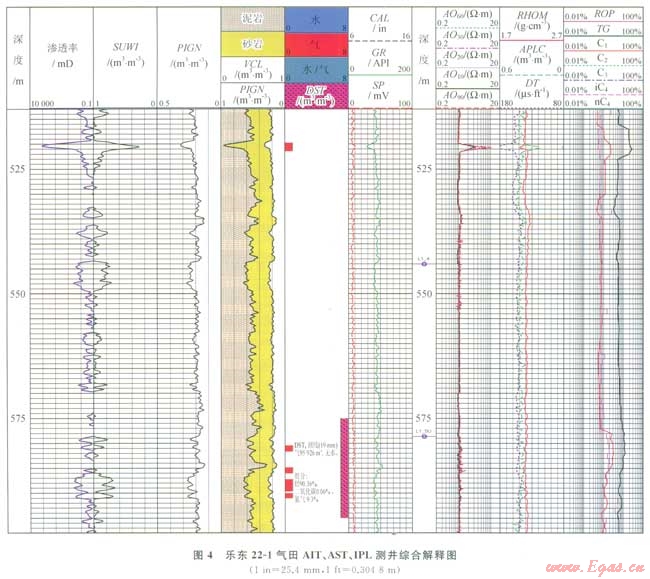 為了提高薄氣層厚度的解釋精度,引進陣列感應測井[12](Array Induction Tool,簡稱AIT)、方位電阻率測井[13](Azimuthal Resistivity Imager,簡稱ARI)、綜合孔隙度測井(Integration Porosity Log,簡稱IPL)提高了薄層厚度的解釋精度。如圖4中在519.7~521.4m,氣層段由于侵入影響AO90電阻率值明顯高于常規(guī)感應電阻率值6W·m左右;而在580.0~591.0m氣層段為砂泥巖交互層段AO90電阻率曲線明顯顯示了砂泥巖薄互層的特性,薄砂層電阻率明顯高于常規(guī)感應電阻率值,而常規(guī)感應電阻率曲線只反映了薄互層的平均電阻率值,同時,AST、IPL等曲線也顯示了與之對應的砂泥巖薄互層的特性。