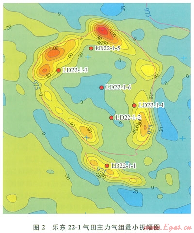 樂東22-1構造是基于1993年采集的二維地震資料解釋發(fā)現(xiàn)的,但是由于受模糊區(qū)的影響,當時所解釋的構造全區(qū)呈“U”形,“U”形范圍內(nèi)地震資料有屬性異常,如該異常代表含氣,則該氣田應屬巖性圈閉氣藏。最終通過6口探井的鉆探,同時在評價期間還增加了高分辨率二維地震資料,落實該氣田主體是一相對完整的大中型穹隆背斜圈閉(圖1)。