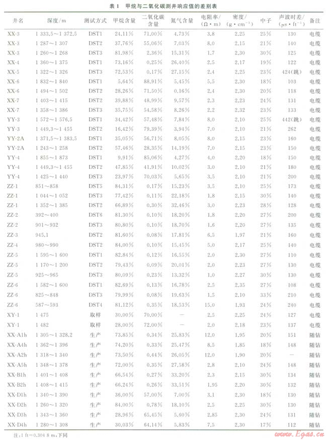 烴類氣與二氧化碳?xì)鈱釉跍y(cè)井曲線上的響應(yīng)特征與油、水層有較明顯的區(qū)別,而它們兩者之間的差異卻較小,這是造成用測(cè)井資料區(qū)分甲烷和二氧化碳困難的根本原因。但通過對(duì)二者理論上測(cè)井響應(yīng)值的研究可知,兩者還是存在一定的差別,因而兩種氣體在測(cè)井曲線上必定存在或多或少的差異,這是用測(cè)井資料定性、定量區(qū)分烴類氣與二氧化碳?xì)獾幕A(chǔ)[4]。